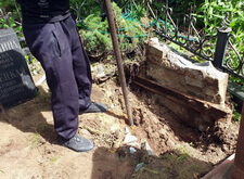 Первым делом мы начали с демонтажа: сняли провалившийся цветник, отодвинули в сторону памятник, полностью удалили ненадёжное основание.