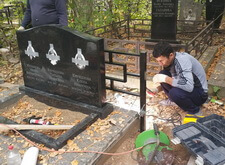Снимаем с памятника защитные наклейки, красим ограждение, наполняем цветник корой.
