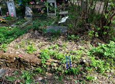В этом заказе мы столкнулись с весьма оригинальным оформлением могилы: как таковой памятник заменяла надгробная плита с именами покойных, а территория участка была покрыта хаотично уложенными камнями. Уборка на месте захоронения была достаточно давно, и могила густо поросла сорняком.